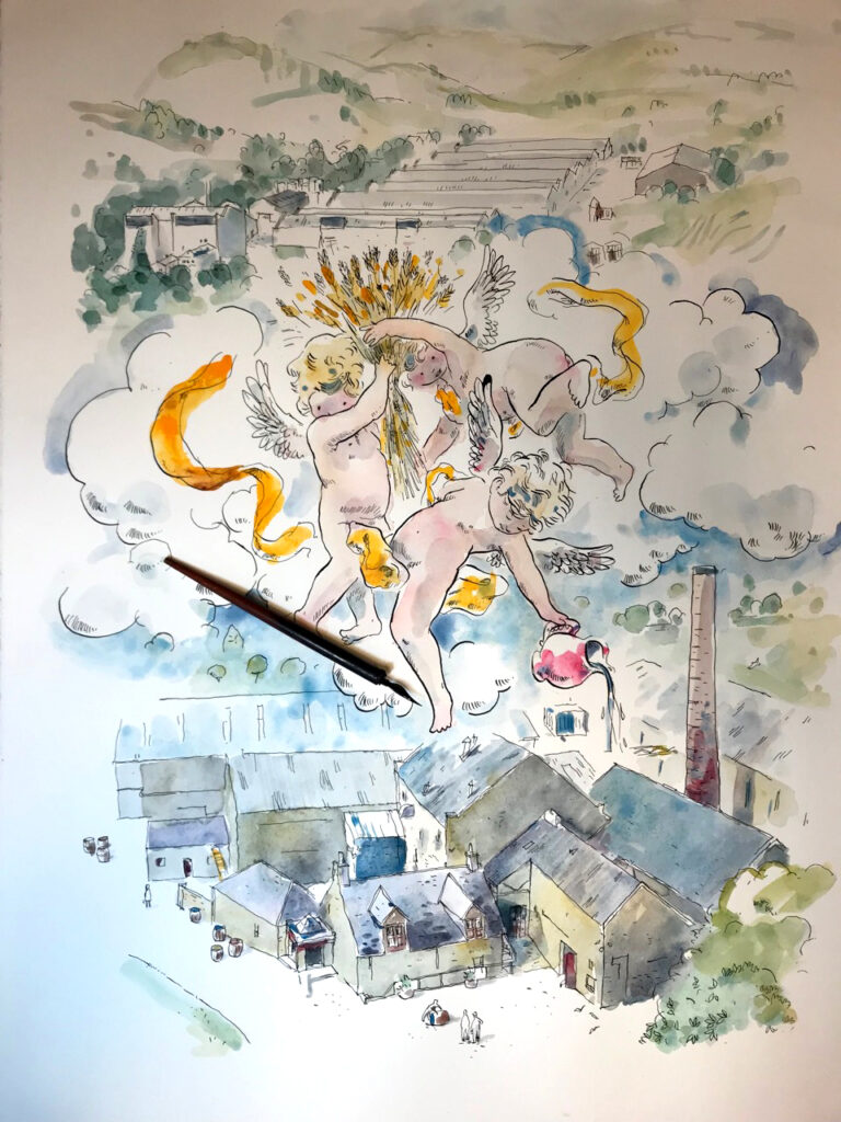 La maison ANGUS DUNDEE spécialisée dans le whisky m’a commandé une oeuvre mettant en avant les 2 distilleries écossaises. La part des anges est bien représentée.