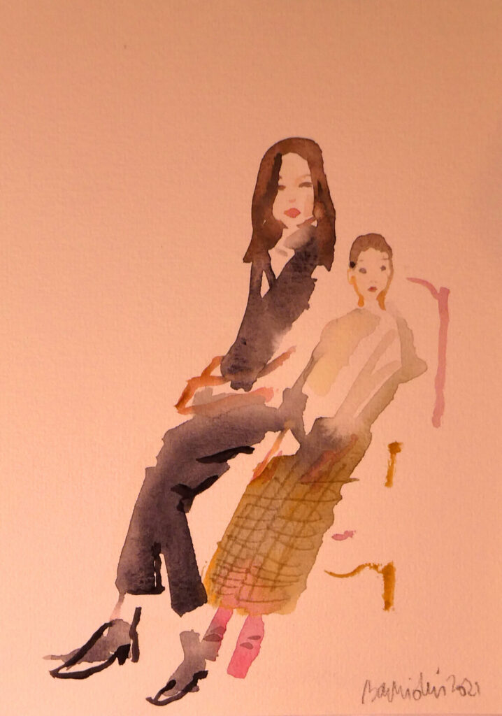 On appelle cela des croquis minutes! En 12 mn environ je réalise des croquis rapides en direct de vos invités à l’aquarelle. Je les peints toujours en pied car un portrait ne concerne pas seulement les visages mais bien l’ensemble du corps!
